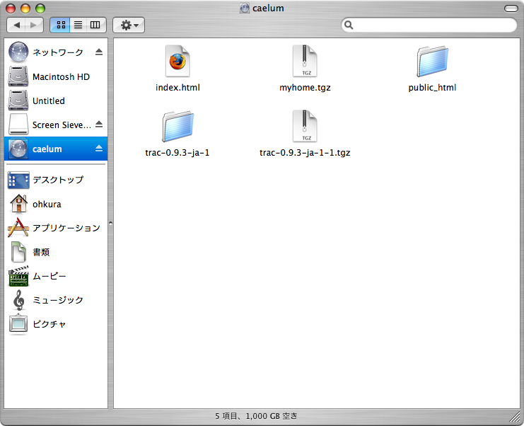 おまけでsshfsというツールが付いていて、これはMacFUSEを使ってssh先のマシンのディレクトリをドライブとしてマウントするというもの。これを使うと、ssh先のマシンの好きなディレクトリをローカルファイルシステムと同じように扱える。FinderでDrag&Dropでファイル操作ができるのはもちろん、アプリケーションからリモートホスト上のファイルを開いたり編集したりできる。